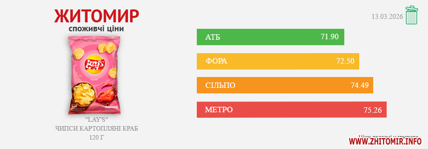 Моніторинг здійснено на основі інформації, отриманої за методом контрольної закупки 13.03.2026 р. у місцях продажу: АТБ, пр. Миру, 15А, Фора, вул. Київська, 106, Метро, пр. Незалежності, 55в, Сільпо, вул. Житній ринок, 1