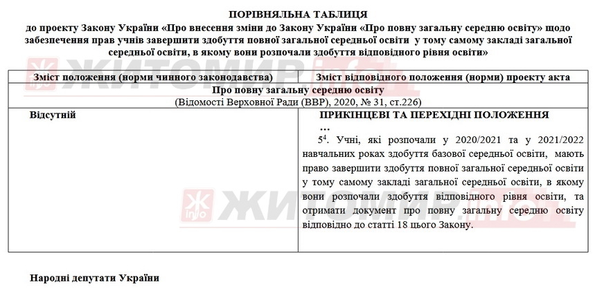 У Верховній раді 16 березня 2026 року зареєстрували законопроєкт про внесення зміни до закону «Про повну загальну середню освіту» щодо забезпечення прав учнів завершити здобуття повної загальної середньої освіти у тому самому закладі загальної середньої освіти, в якому вони розпочали здобуття відповідного рівня освіти.
