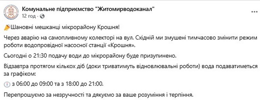 «Шановні мешканці мікрорайону Крошня! Через аварію на самопливному колекторі на вул. Східній ми змушені тимчасово змінити режим роботи водопровідної насосної станції «Крошня». Сьогодні о 21:30 подачу води до мікрорайону буде призупинено. Відзавтра протягом кількох діб (доки триватимуть відновлювальні роботи) вода подаватиметься за графіком: з 06:00 до 09:00 та з 18:00 до 21:00. Перепрошуємо за незручності та дякуємо за ваше розуміння і терпіння», - йдеться у повідомленні.