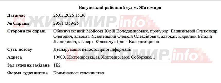 Нагадаємо, Національне агентство з питань запобігання корупції у 2024 році проводило перевірку декларації за 2022 рік депутата Житомирської міської ради Юрія Мойсеєва і виявило недостовірні відомості на майже 5 млн грн. В жовтні 2025 року кримінальну справу Мойсеєва, якого обвинувачують у декларуванні недостовірної інформації (ч.1.ст.366-2 КК України), передали до суду, чергове судове засідання призначене на 25 березня 2026 року.
