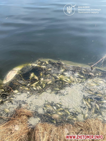 «23 березня 2026 року, реагуючи на повідомлення у соціальних мережах щодо масової загибелі водних біоресурсів у Шверидовому ставі на річці Крошенка, державні інспектори з охорони навколишнього природного середовища Поліського округу здійснили оперативний виїзд на місце події. До обстеження були залучені працівники Житомирського рибоохоронного патруля. Спільно проведено комісійне обстеження берегової лінії та акваторії водойми. Також на місце події викликано слідчо-оперативну групу поліції та представників органу місцевого самоврядування», - йдеться в повідомленні.