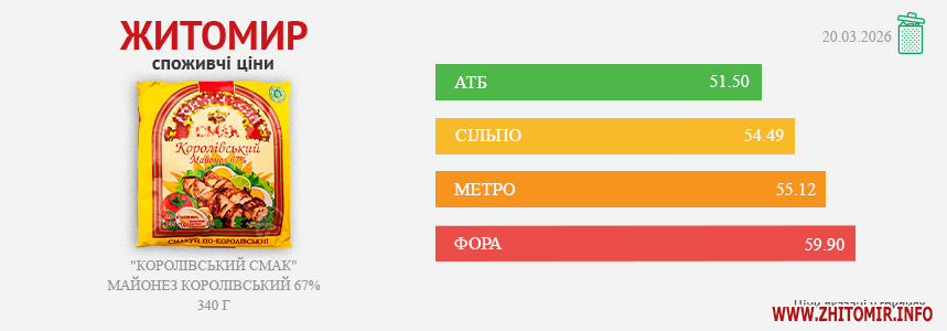 Моніторинг здійснено на основі інформації, отриманої за методом контрольної закупки 20.03.2026 р. у місцях продажу: АТБ, пр. Миру, 15А, Фора, вул. Київська, 106, Метро, вул. Ватутіна, 55-в, Сільпо, вул. Житній ринок, 1