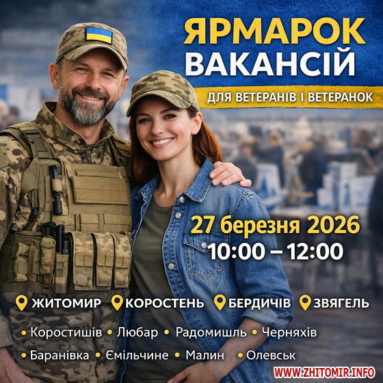 27 березня відбудеться загальнообласний ярмарок вакансій для ветеранів і ветеранок. Заходи відбудуться відразу у 12 містах і селищах Житомирської області.
