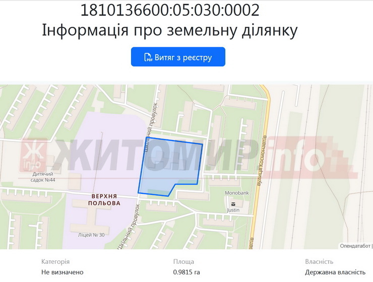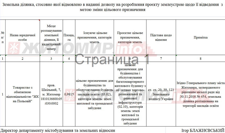 У додатку зазначено, що земельна ділянка площею 0,9815 га знаходиться на провулку Шкільному, 7 і має цільове призначення «для будівництва та обслуговування будівель закладів освіти», а ТОВ просило змінити його на «для будівництва і обслуговування багатоквартирного житлового будинку з об’єктами торгово-розважальної та ринкової інфраструктури». Підставою для відмови стало те, що відповідно до Генплану земельна ділянка розташована на території закладів освіти.