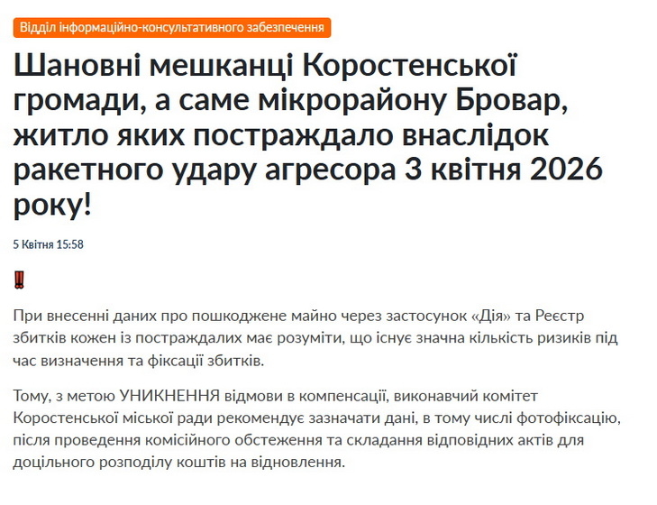 Зауважимо, на сайті Коростенської міської ради є публікація від 3 квітня щодо того, як власникам пошкоджених або знищених будинків діяти після обстрілу і з якими документами потрібно звертатися до органів влади. А 5 квітня на сайті міськради опублікували пораду щодо фотофіксації пошкоджень.
