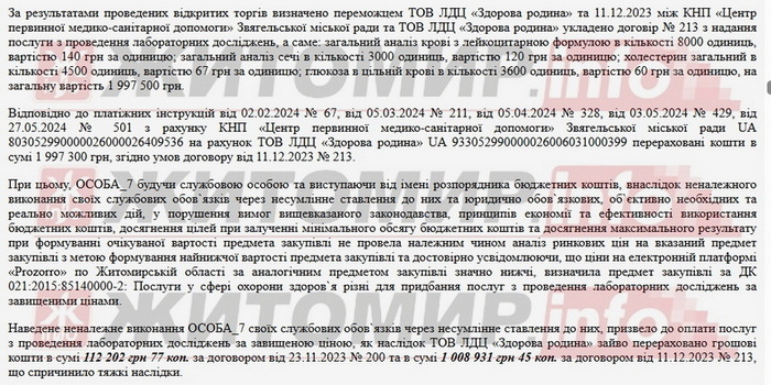 Зазначимо, у вироці суду вказано, що неналежне виконання своїх службових обов`язків через несумлінне ставлення до них, призвело до оплати послуг з проведення лабораторних досліджень за завищеною ціною, як наслідок ТОВ ЛДЦ «Здорова родина» зайво перераховано грошові кошти в сумі 112 202 грн 77 коп. за договором від 23.11.2023 № 200 та в сумі 1 008 931 грн 45 коп. за договором від 11.12.2023 № 213, що спричинило тяжкі наслідки.