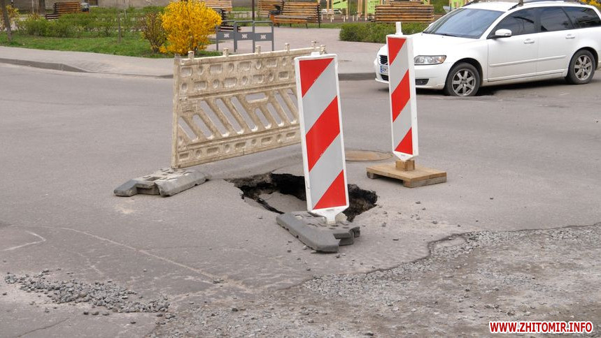 У Житомирі на перехресті вулиць Шевченка та Князів Острозьких провалився асфальт. Станом на 21 квітня місце провалля огородили відповідними знаками, водіям доводиться об’їжджати пошкоджену ділянку.