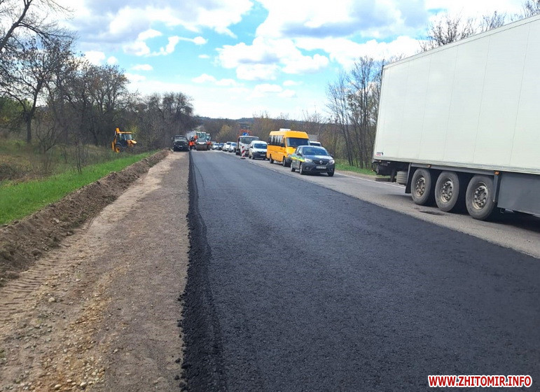 Одночасно двома асфальтоукладальниками відновлюють дорожнє покриття на об’їзді міста Бердичів. Також на ще одній ділянці автошляху працює дорожня фреза.