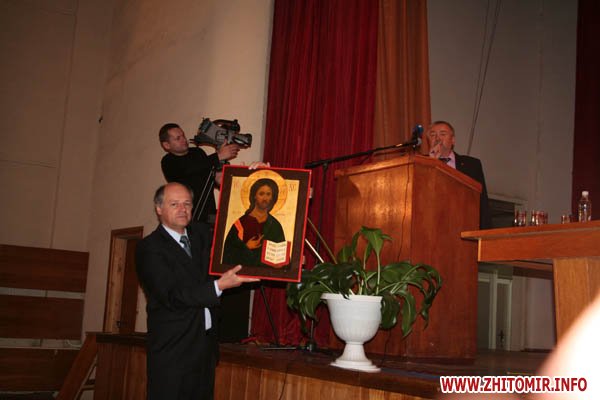 Именно с таким предложением выступил на совещании Международной общественной организации «Землячество житомирян» московский художник Виктор Демянчук. Его предки, дед и бабушка родились в селе Бурковцы Чудновского района. Сам художник постоянно бывает в Украине, ощущает свое национальное родство и желает каким-то образом участвовать в восстановлении культуры и духовности в нашей стране. И в этот приезд он приехал на Родину не с пустыми руками - привез выполненную им икону Дмитрия Салунского, которую завтра, 8 ноября, хочет подарить церкви его родного села Бурковцы, она носит имя святого. Этот день в селе считается большим праздником.