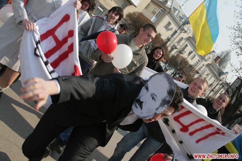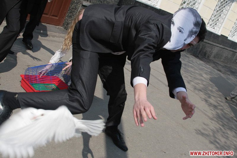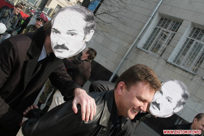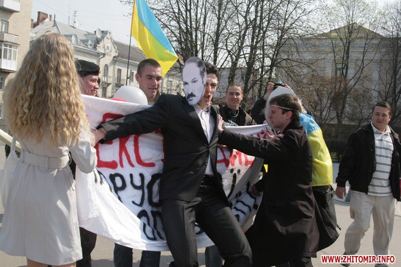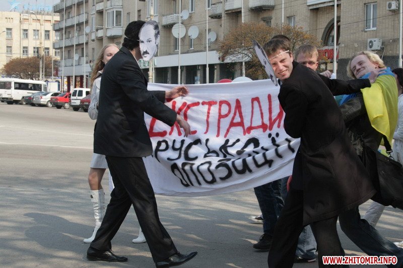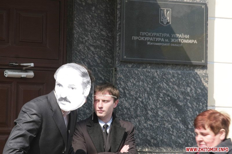 Флешмоб проходив у вигляді сценки-мітингу, активісти пройшли з транспарантами центральними вулицями (від Михайлівської до Черняхівського, де знаходиться міська прокуратура). "Лукашенки" залякували активістів, не даючи їм проходу.