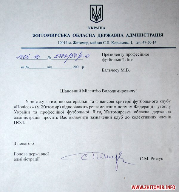 Официальные документы о возрождении ФК "Полесье" и вступлении клуба в ІІ-лигу чемпионата Украины по футболу