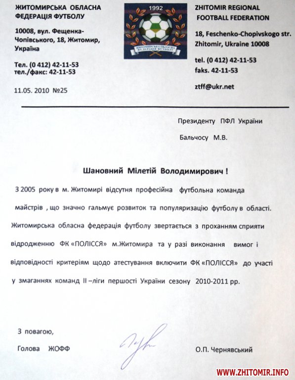 Официальные документы о возрождении ФК "Полесье" и вступлении клуба в ІІ-лигу чемпионата Украины по футболу