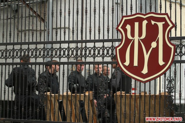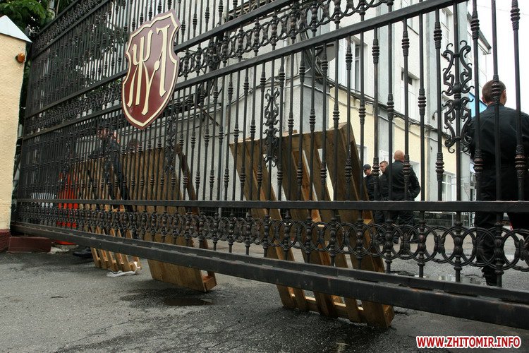 На предприятии “Житомирські ласощі» 23 июня должно было состояться собрание акционеров. С утра около проходной на территории завода – сотрудники частной охраны в черном. С улицы Щорса к воротам с территории завода кто-то прислонил деревянные поддоны с намеком, что въезд любому транспорту запрещен.