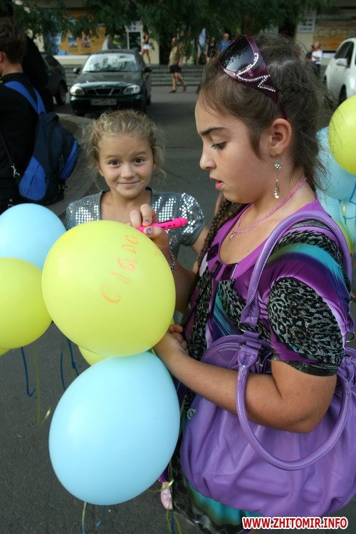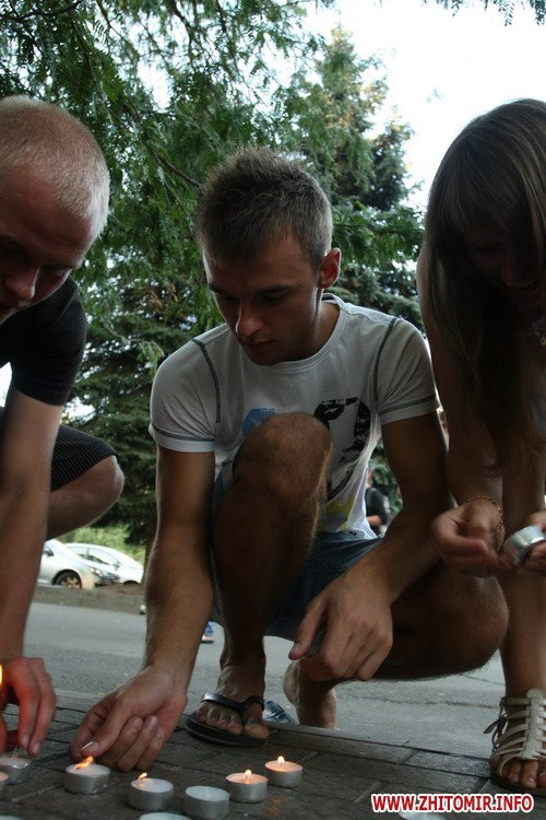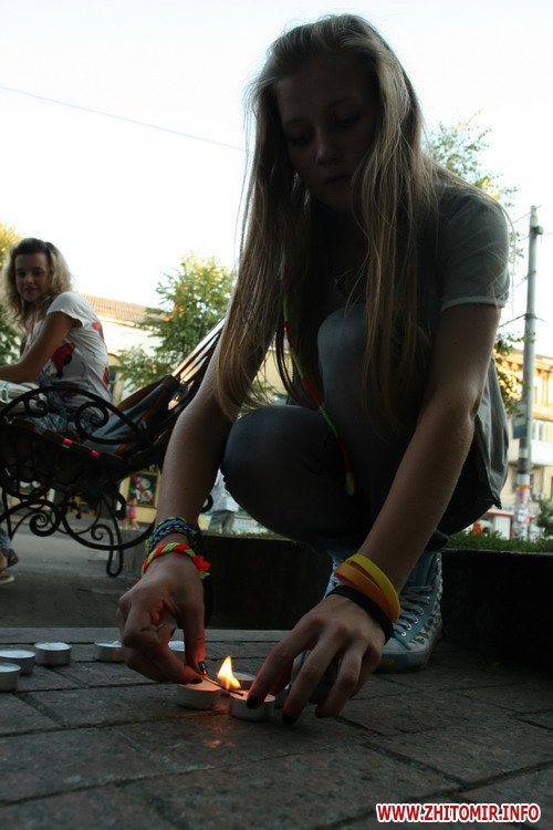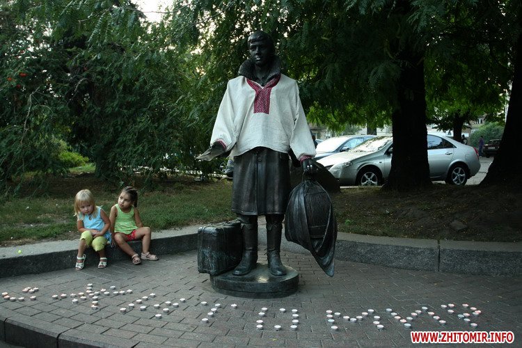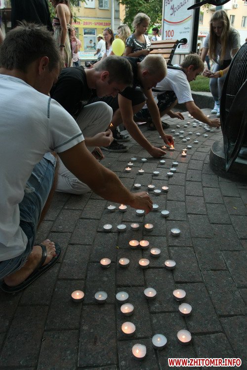 Собравшиеся люди, вокруг памятника, выложили из свечек слово «Житомир» и запускали в небо сине-желтые шары.