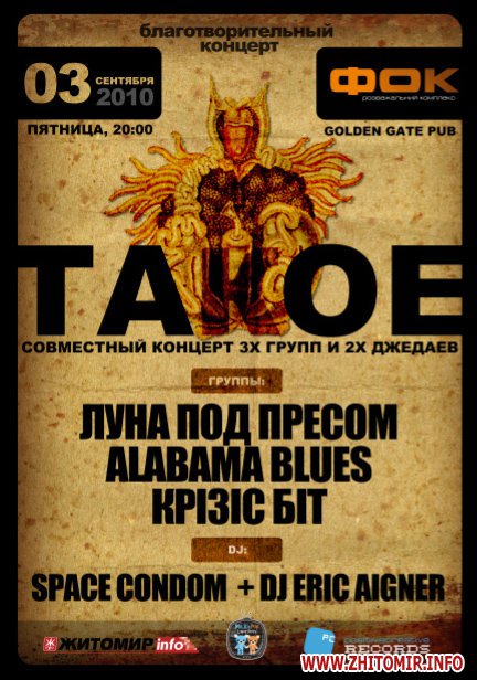 По традиции, продолжение выставки пройдет в Голден Гейт Пабе в рамках уникального благотворительного концерта с выступлением лучших житомирских групп: «Алабама Блюз», «Кpізіс Біт» и «Луна Под Пресом», а также диджеев SpaceCondom и Eric Aigner (тот самый - известный основатель "Eric's Family" и "Eric's New Family" ). Начало в 20.00