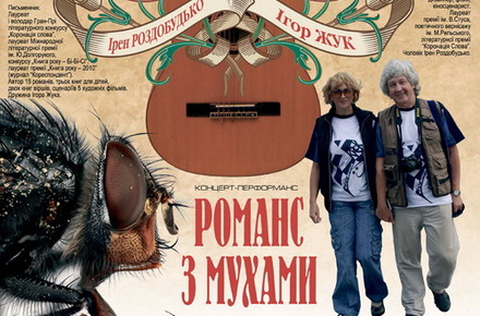 «Романс з мухами» – цю назву ми дали нашому творчому вечерові-перформансу не для епатажу чи зайвого привернення уваги. Просто так називається невеличка пісенька, котра народилася як наша домашньо-родинна, але нам закортіло поділитися з усіма не стільки нею, скільки її настроєм. До того ж сама програма концерту буде насичена розмаїтими «мухами», котрі кусали нас у різний спосіб, внаслідок чого з’являлися нові пісні, книги, фільми, малюнки, думки. Не будемо розкривати її наперед, але зробимо усе, щоб ті, хто прийде до нас, не пожалкували про згаяний вечір.