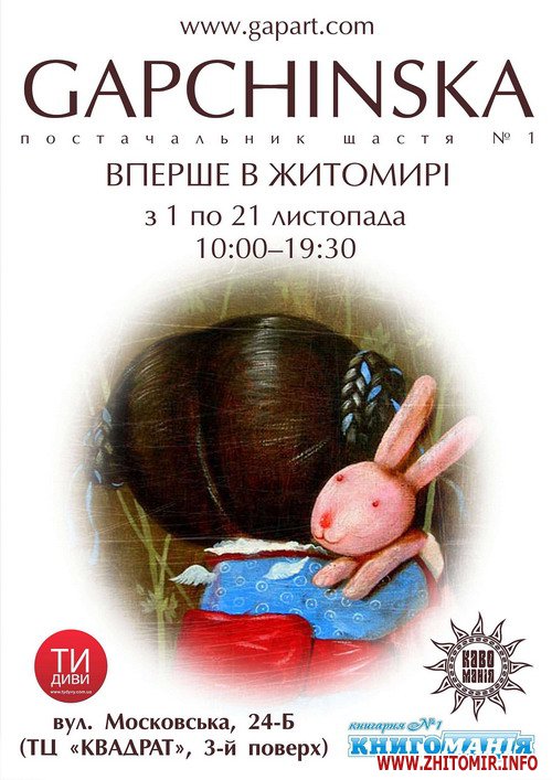 В Житомире впервые открывается выставка робот известной художницы Евгении Гапчинской. Работы художницы будут экспонироваться в «Кавомании» с 1 по 21 ноября (ул. Московская 24-Б, ТЦ «Квадрат», 3-й этаж).