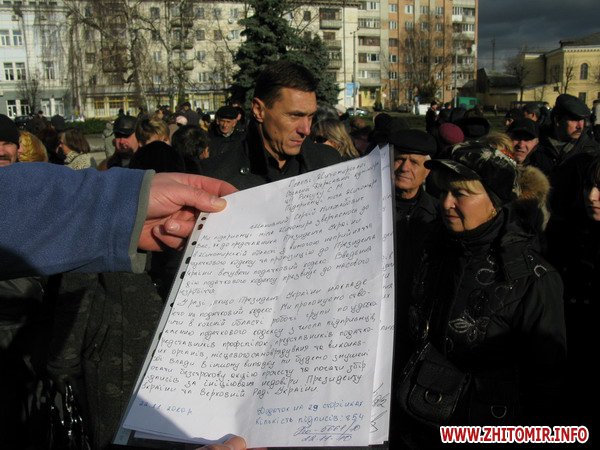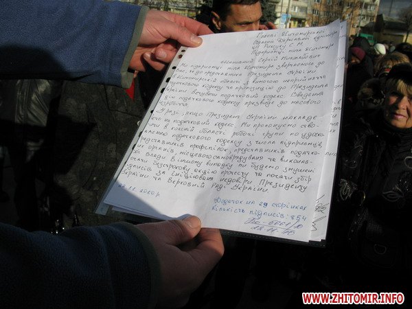 Если же президент не ветирует кодекс, предприниматели готовы к бессрочной акции протеста сбору подписей для выражения недоверия президенту. Впрочем, уже за недоверие Януковичу подписалось более 500 предпринимателей Житомира.