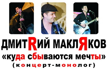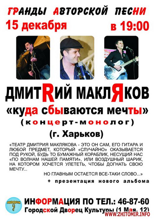В Житомире 15 декабря в 19:00 в Городском Дворце Культуры пройдет концерт-монолог «Куда сбываются мечты» знаменитого харьковского актера и музыканта Дмитрия Маклякова.