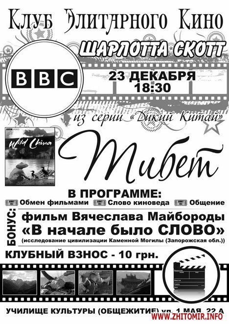 В Житомире 23 декабря в 18.30 в Клубе Элитарного кино (Училище культуры (общежитие) ул. 1 Мая, 22а) состоится показ фильма Шарлотты Скотт «Тибет» из серии документального сериала «Дикий Китай». Бонус: Фильм Вячеслава Майбороды «В начале было СЛОВО».