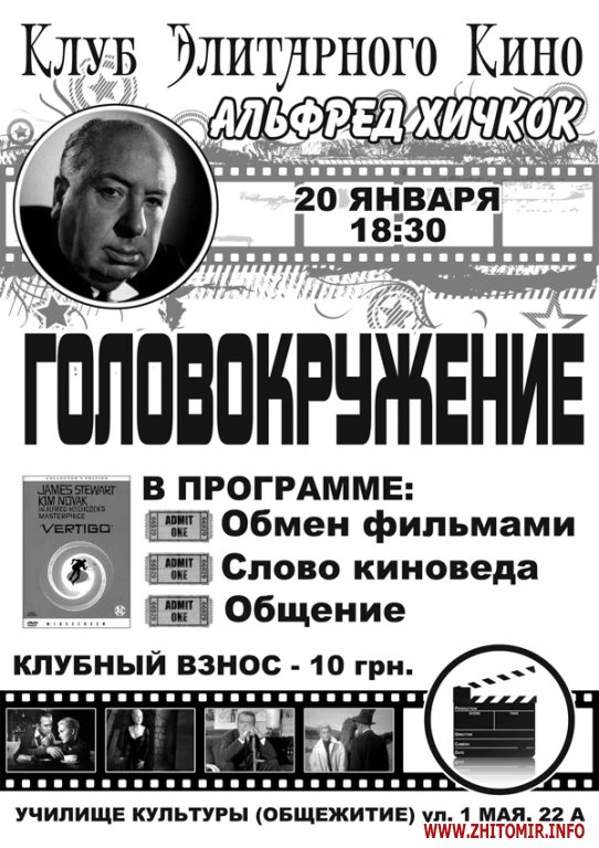 20 января житомирский Клуб элитарного кино приглашает на просмотр фильма Альфреда Хичкока «Головокружение». Начало – в 18.30, училище культуры (общежитие), ул. 1 Мая, 22а. Клубный взнос – 10 грн.