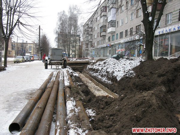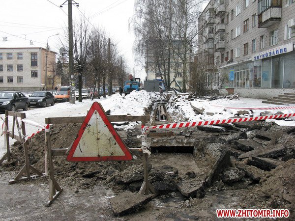 Практически на каждой улице в Житомире следы коммунальных аварий. Даже не стоит далеко ходить. На улице Котовского в районе спортшколы вчера прорвало водопровод. Вода текла по проезжей части, да так и замерзла. Рабочие говорят, что с вечера до ночи ликвидировали аварию, вот теперь уже «трамбуют» яму.
