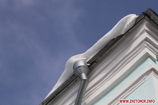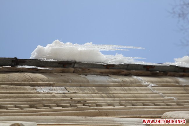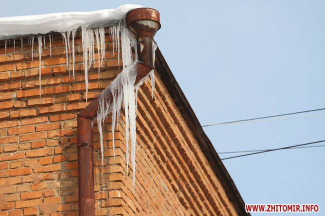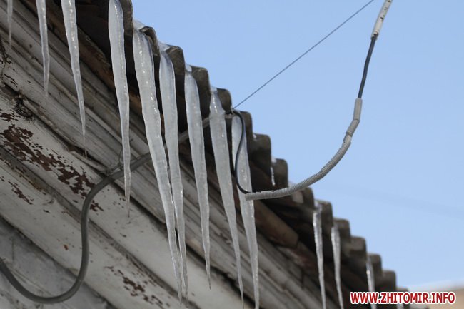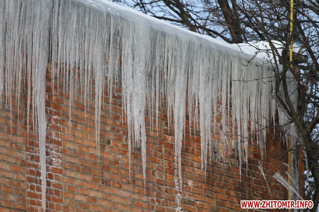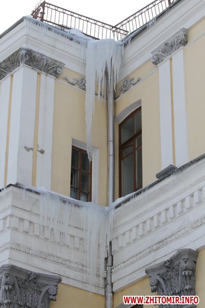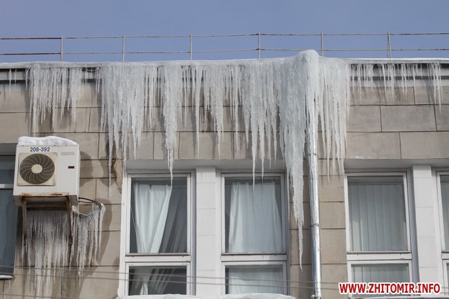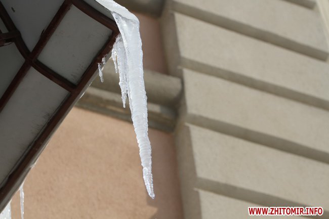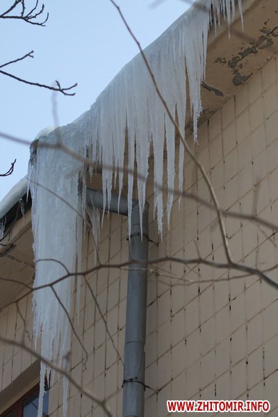 Кстати, на сосульки обратил и председатель Житомирского областного совета Иосиф Запаловский: «Мое окно выходит на дом пионеров. Кто обратил внимание, какие висят сосульки. Минус 10 на улице, идет снег, на солнце греется шатровая крыша. Это надо чтобы температура была как минимум +11, чтобы сосульки растаяли. Обращаюсь к МЧС: сделайте анализ таких домов, чтобы не было несчастных случаев».