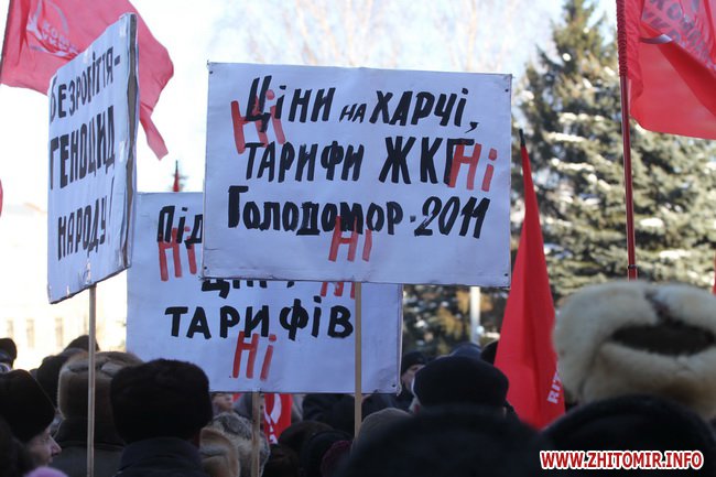 1 марта в Житомире Коммунистическая партия Украины под стенами областного совета провела митинг против повышения тарифов ЖКХ и цен на продукты. Поддержать акцию протеста пришло около тысячи житомирян – преимущественно пенсионеры.
