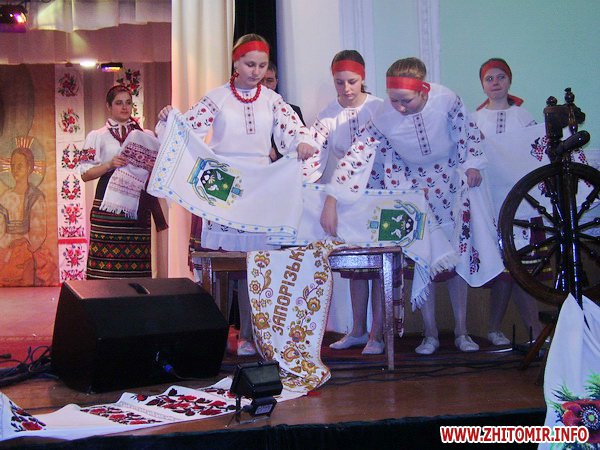 Вишивання фрагментів рушника національної єдності від Житомирщини та Андрушівського району супроводжувалося на сцені самобутніми піснями у виконанні народних аматорських колективів.