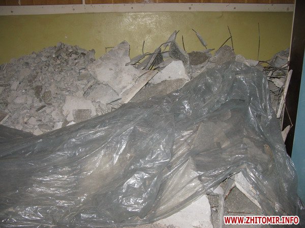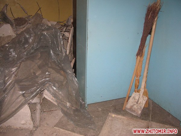 Мэрия Житомира встречает посетителей табличкой с извинениями о временных неудобствах. В коридоре первого этажа – ремонт. Плитка на полу сбита до цемента, ее осколки свалены под пленку тут же в углу. Рядом – лопата и метла.