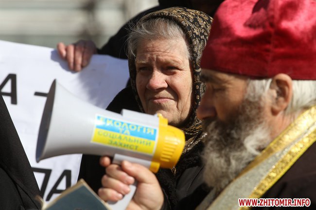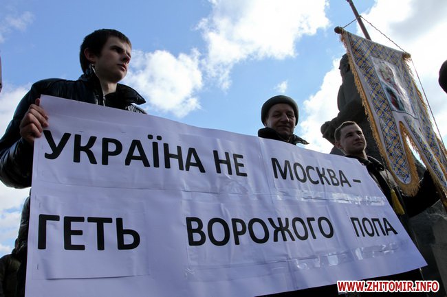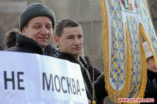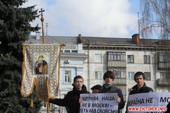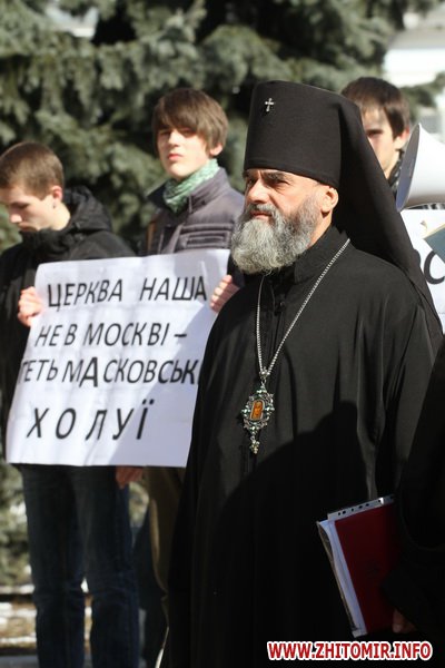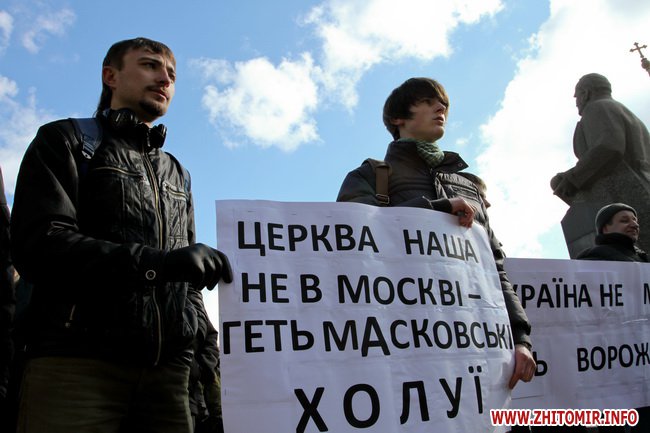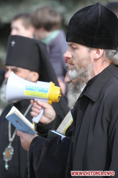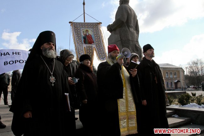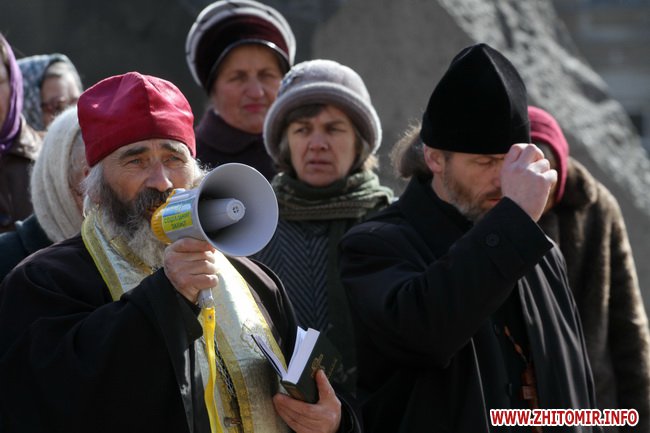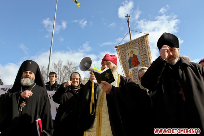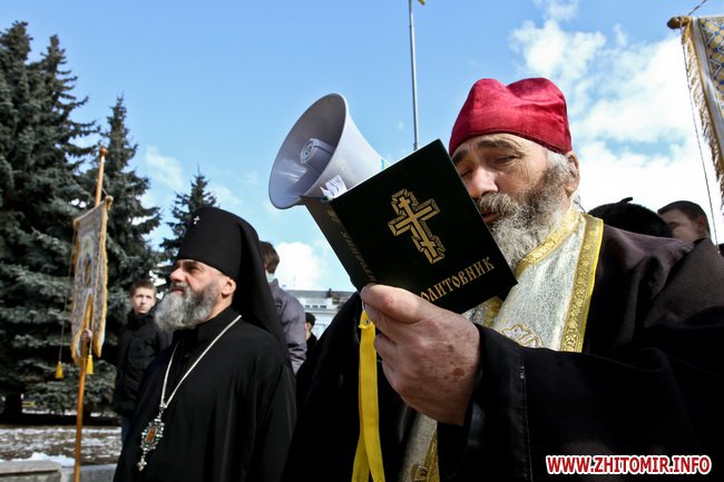 В Житомире 21 марта прихожане и священники Украинской православной церкви киевского патриархата провели молебен и митинг под стенам облгоадминистрации.