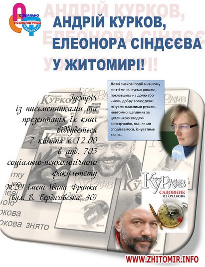 У Житомирі свої нові книги презентують Андрій Курков (роман "Садівник із Очакова") та переможниця конкурсу "Євроформат - 2009" Елеонора Сіндєєва (роман "Скарб").