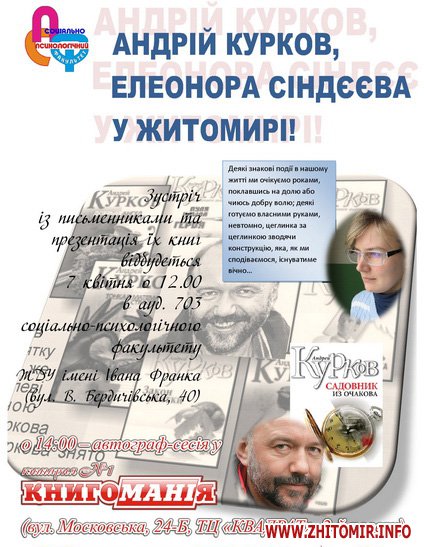 Як повідомили Житомир.info організатори, зустріч з письменниками та презентація книг відбудеться 7 квітня о 12.00 в Житомирському державному університеті (ауд. 703, соціально-психологічний факультет, вул. В.Бердичівська, 40), а о 14.00 у «Книгоманії» (вул. Московська, 24-б) Андрій Курков та Елеонора Сіндєєва проведуть автограф-сесію.