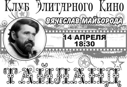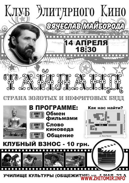 14 апреля житомирский Клуб элитарного кино приглашает на просмотр фильма Вячеслава Майбороды «Тайланд». Начало – в 18.30, училище культуры (общежитие), ул. 1 Мая, 22а. Клубный взнос – 10 грн.