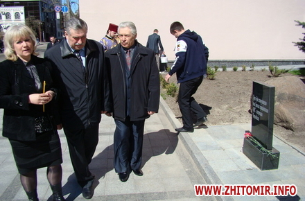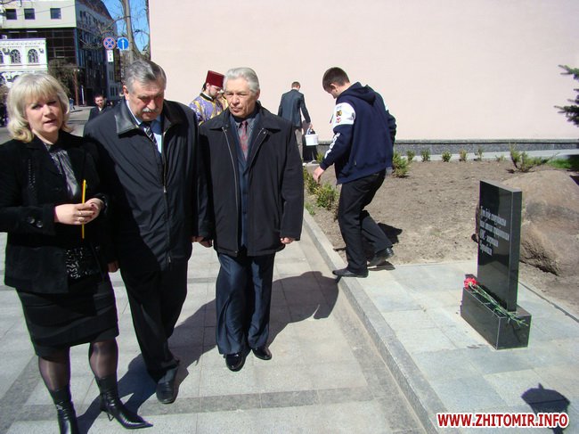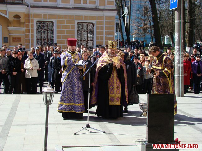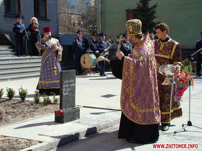 Настоятель Свято-Михайлівського кафедрального собору отець Стефаній провів обряд освячення місця встановлення обеліску. До його підніжжя лягли червоні гвоздики від нинішніх працівників органів внутрішніх справ Житомирщини та членів родин ліквідаторів.