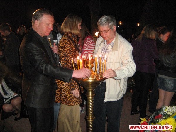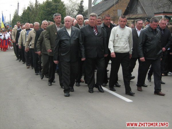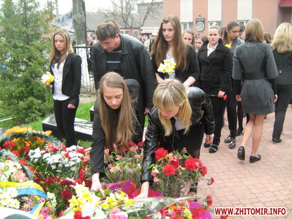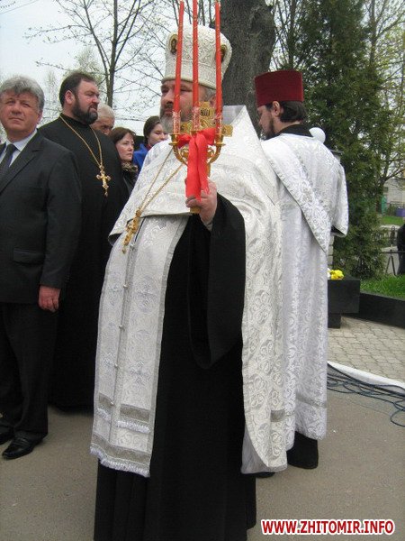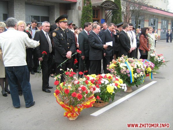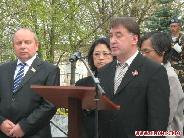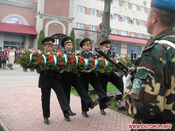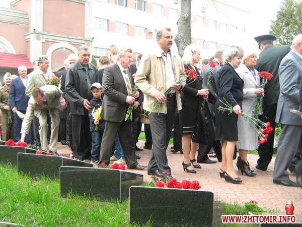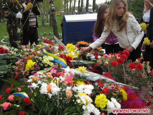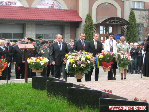 Вранці, 26 квітня, на мітингу скорботи звернулися до численних присутніх перші особи області та міста. Пекучу біль за стан соціального захисту та підтримці ліквідаторів висловив один з них – голова благодійного фонду «Рятувальник Житомирщини» Олег Товянський. Слова підтримки українського народу, і зокрема полісян, висловила член Ради японської асоціації «Чорнобиль-Тюбу» Мичне Джинно. Ця організація понад 20 років надає благодійну допомогу ліквідаторам та населенню області, постраждалим від чорнобильської катастрофи. Після виступів до гранітних плитах посадові особи, представники громадськості, ветеранських організацій, молодь та жителі міста поклали гірлянди, вінки та квіти. Священики відслужили молебень. Пам'ять героїв присутні вшанували хвилиною мовчання, військові – триразовим салютом. У парадному строю честь померлим героям, які врятували світ, віддали ветерани-ліквідатори, офіцери-рятувальники, воїни-десантники та прикордонники.