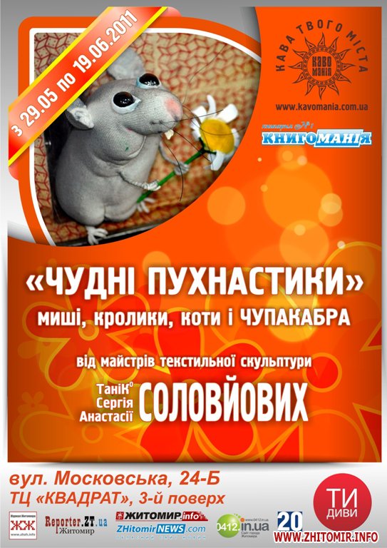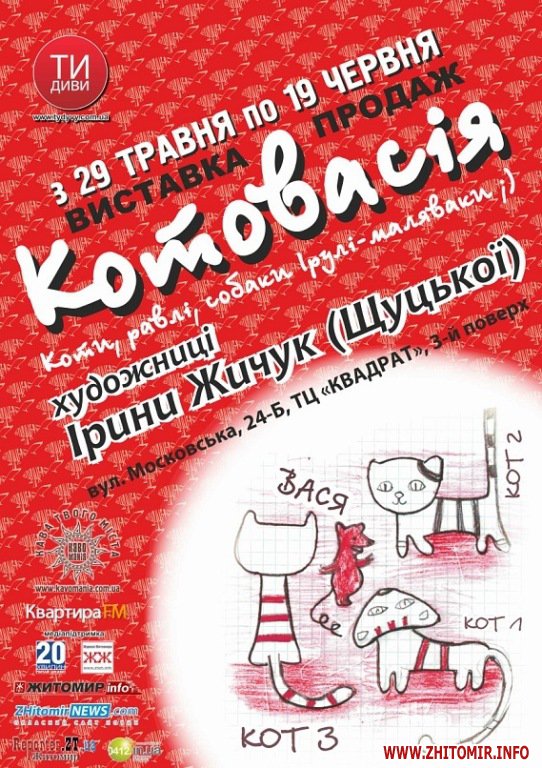 З 26 травня по 19 червня у приміщенні «Кавоманія» (вул. Московська, 24-Б, торговельний центр «Квадрат», 3-й поверх) проходять виставки «Котовасія» Ірини Шуцької (м. Луцьк) та «Чудові пухнастики» ТаніКо, Сергія та Анастасії Соловйових (м. Житомир).