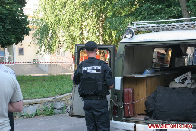 14 червня близько 19 години на спецлінію «102» надійшло повідомлення від жительки м. Житомира про те, що в фойє першого поверху будівлі, в якій розташоване підприємство, в якому вона працює, на підлозі виявлено целофановий пакет з коробкою, до якої ведуть дроти з мигаючими світлодіодами.