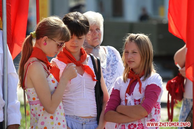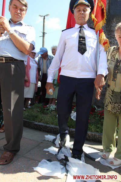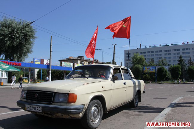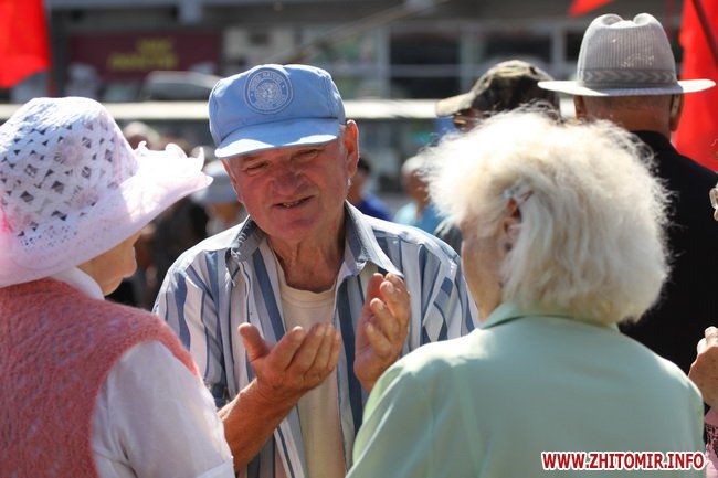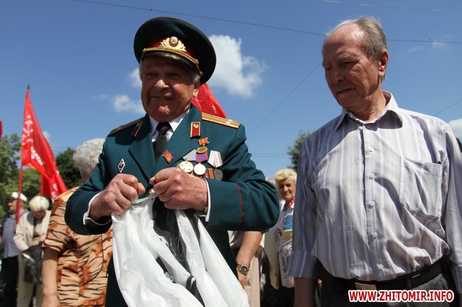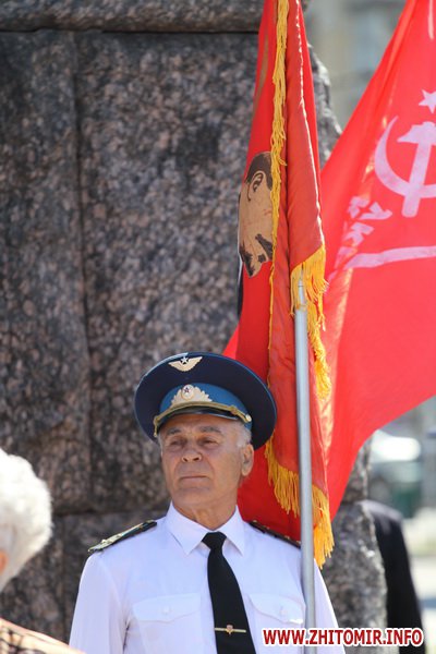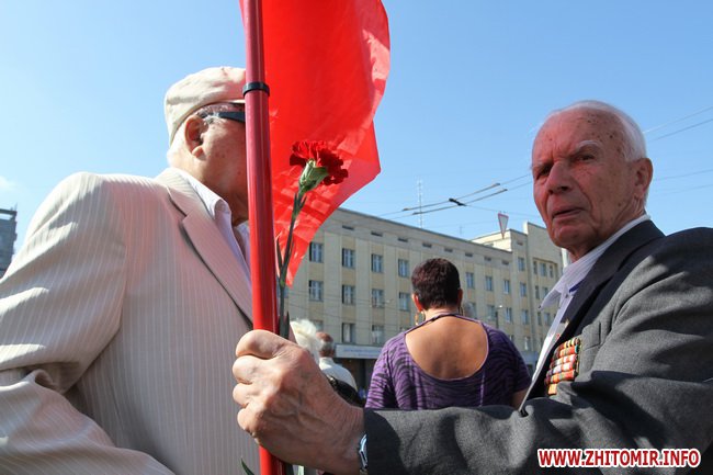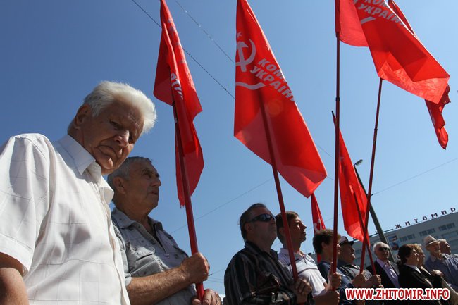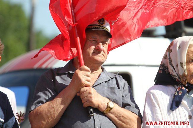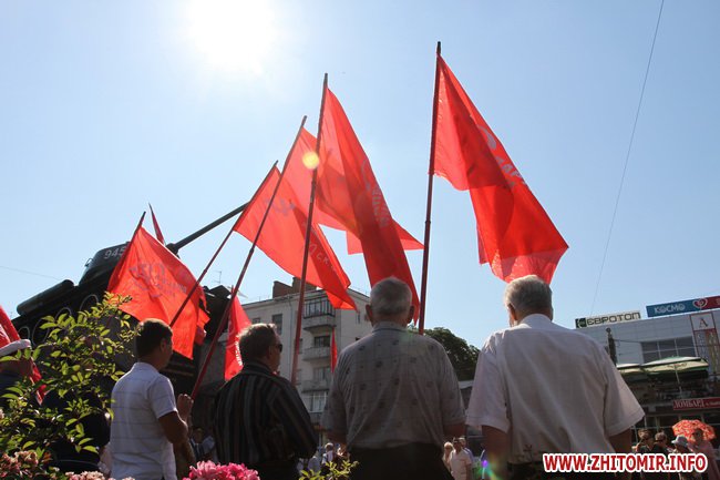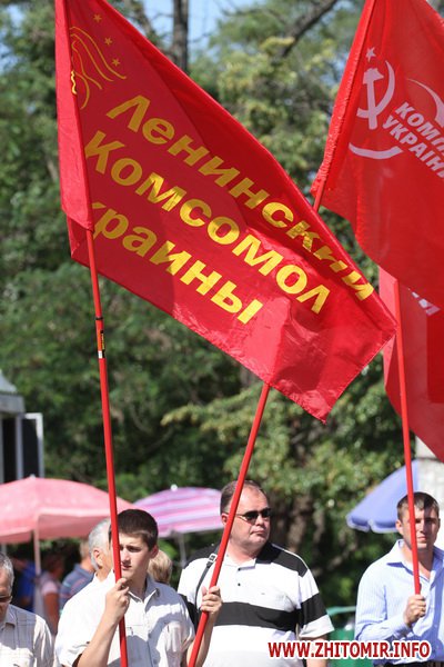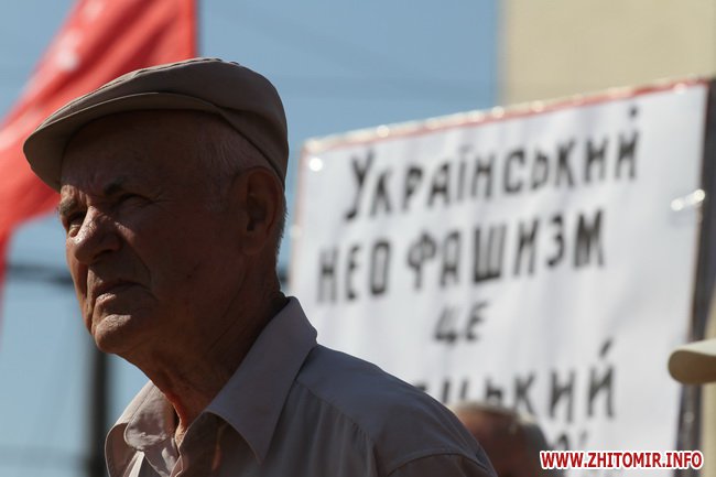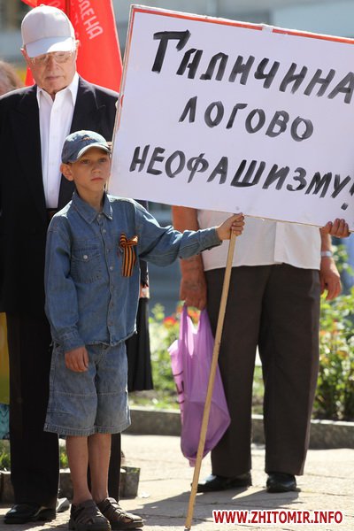 Участники митинга держали в руках красные флаги и плакаты с лозунгами: «Галиччина – логово неонацизма», «Молодь Житомирщини протии фашизму», «Український неофашизм – це німецький фашизм 30-х р.р.» и другие.