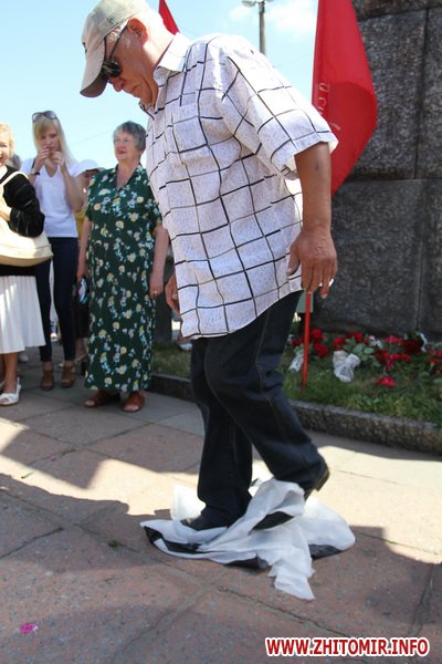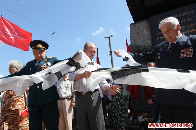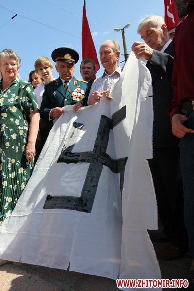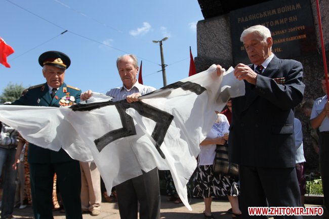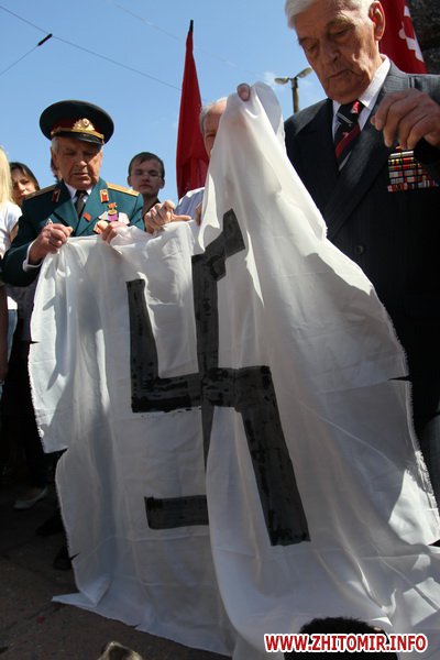В Житомире 22 июня сторонники коммунистической партии Украины во время митинга осудили неофашизм и порвали транспарант со свастикой.
