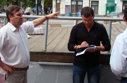 Заступник міського голови емоційно спілкувався з чиновниками та бізнесменами посеред пішохідної вулиці. Тема – занедбані фасади будинків, які використовуються з комерційною метою.