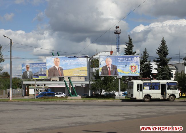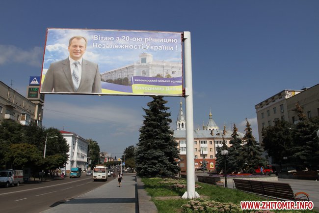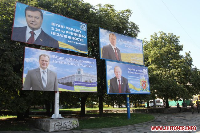 День Независимости Житомирщина будет отмечать, по словам губернатора области, «без пафоса, но гордо». Особая гордость за юбилей страны у руководства: все «центровые» биллборды Житомира отданы под так называемую «социальную рекламу» - поздравления налогоплательщикам за их же деньги от власть предержащих.