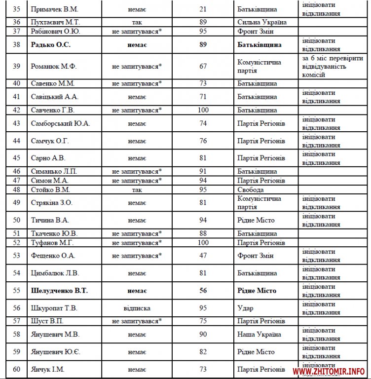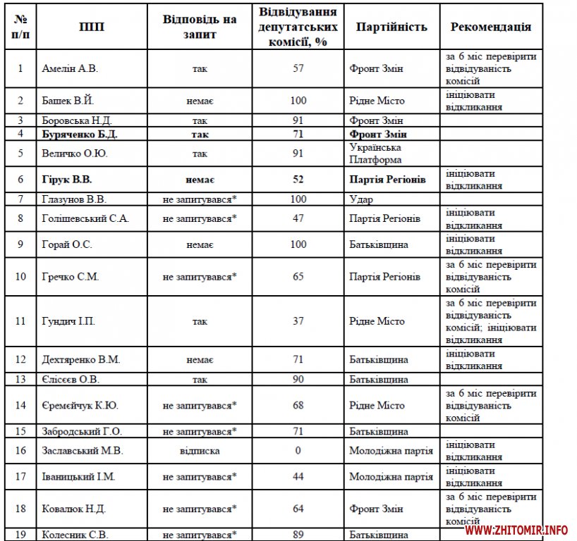 * примітка: запити на інформацію (запитані передвиборчі програми та звіт за сім місяців депутатської роботи) були розіслані всім депутатам-мажоритарникам (30), головам фракцій (Батьківщина, Партія Регіонів, Рідне Місто, Фронт Змін) та представнику інших політичних сил, представлених у Житомирській міській раді (Комуністична партія, Молодіжна Партія, Удар, Українська Платформа, Свобода)