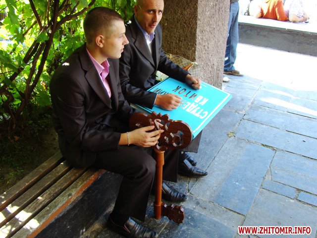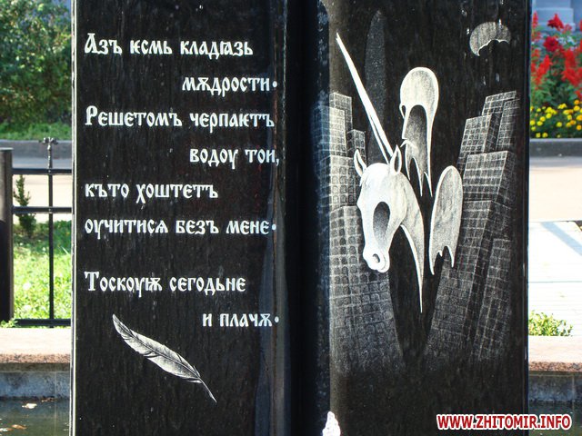 Цього ж дня урочисто відкрили фонтан біля головного корпусу університету. На «чорній книзі» з’явився іронічно-дидактичний надпис старослов’янською мовою та символічний малюнок у стилі вуличного графіті. Житомир.info вже писав про цей фонтан 3 серпня, зауваживши, що тоді біля нього ніде було присісти. Тепер ситуація інша: і біля фонтану, і біля входу стоять великі зручні лави.
