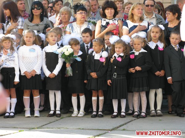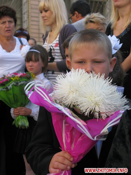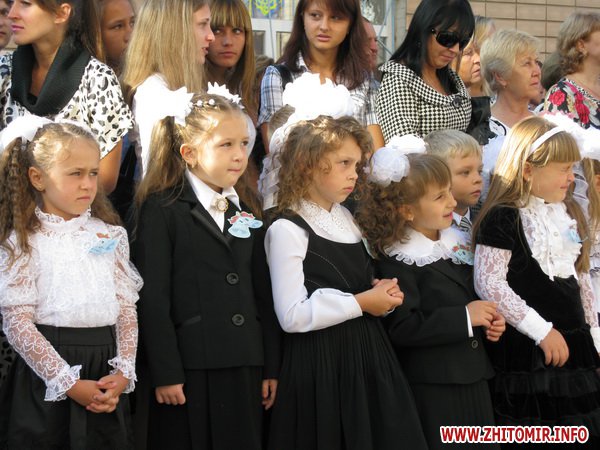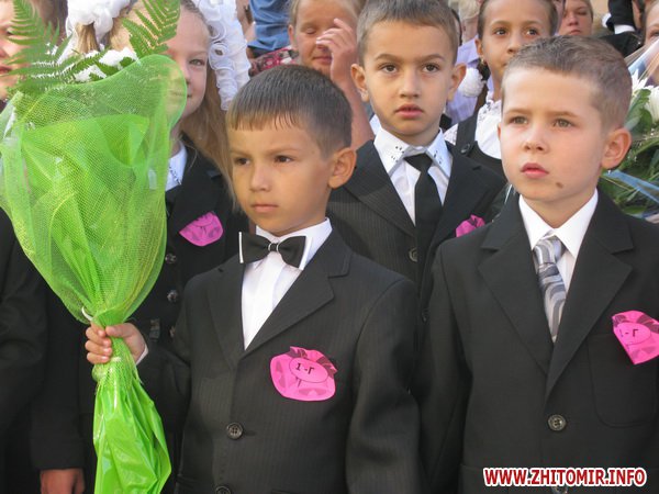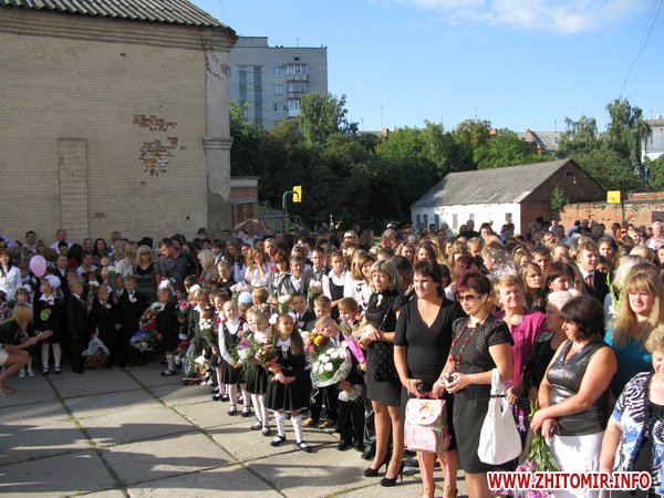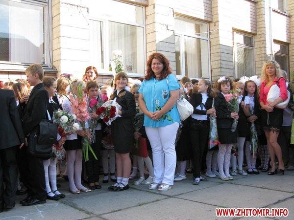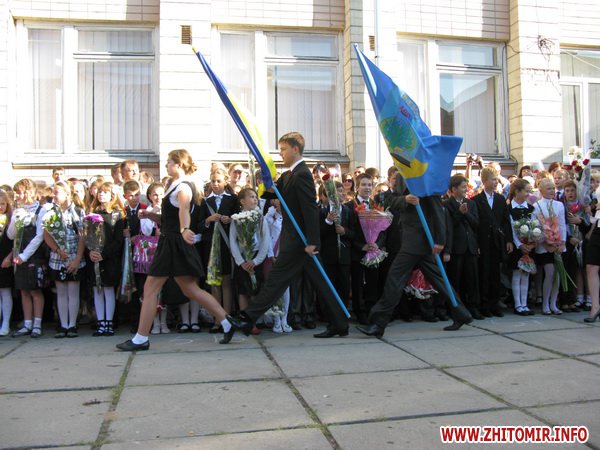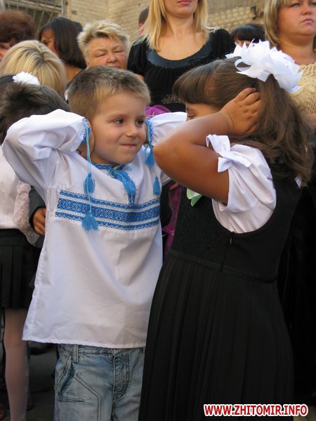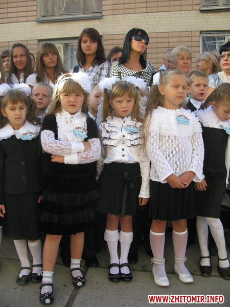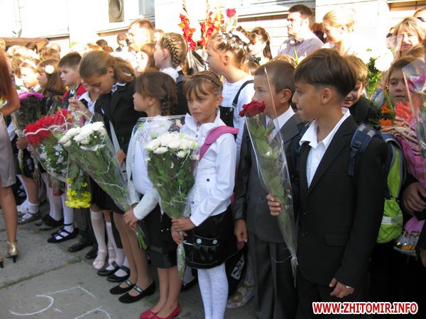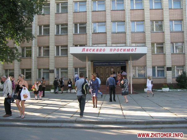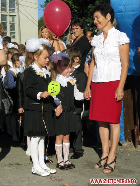 У Житомирській міській гуманітарній гімназії №23 на урочисту лінійку запрошують не всіх. Невелике подвір’я школи вмістило цього дня учнів 5-х, 10-х, 11-х класів і тих, для кого цей дзвоник дійсно перший у житті – першокласників. Цього року у гуманітарній гімназії п’ять 1-х класів.