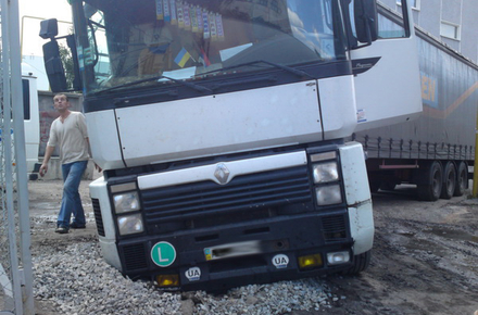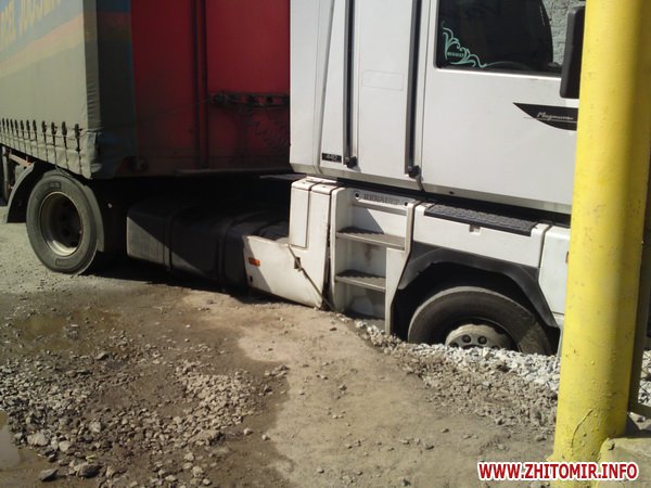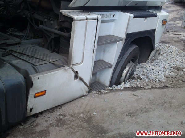 Но есть более экономный вариант решения дорожных проблем – чем-то засыпать яму. Так и сделали возле одной из житомирских фирм, которая находится в переулке за «Автолюксом». Только видимо горе-ремонтники просчитались с количеством щебня, или может яма оказалась «бездонным болотом» и фура загрузла в нем по самую кабину.