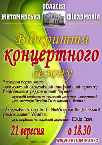 21 вересня у приміщенні Житомирської обласної філармонії – концерт з нагоди відкриття нового сезону, повідомляє Афіша Житомира. Перед житомирянами виступатимуть: