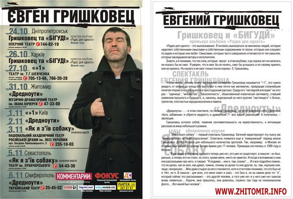 31 октября в Житомирском областном музыкально-драматическом театре им.И.Кочерги выступит писатель и актер Евгений Гришковец с пьесой «Дредноуты».