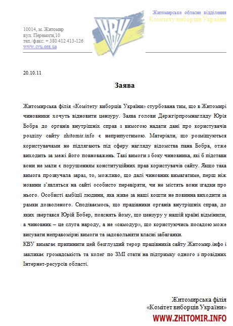 Житомирська філія «Комітету виборців України» стурбована тим, що в Житомирі чиновники хочуть відновити цензуру. Заява голови Держгірпромнагляду Юрія Бобра до органів внутрішніх справ з вимогою надати дані про користувачів розділу сайту zhitomir.info є неприпустимою. Матеріали, що розміщуються користувачами не підлягають під сферу нагляду відомства пана Бобра, отже виходить за межі його повноважень. Такі вимоги з боку чиновника, які б підстави вони не мали є порушенням конституційних прав користувачів сайту. Якщо така вимога прозвучала зараз, то, можливо, що далі чиновник вимагатиме, перш ніж новини з’являться на сайті особисто перевіряти, чи не містять вони згадки про нього. Особисті амбіції людини, яка живе за наші кошти не повинна виходити за рамки дозволеного. Сподіваємось, що працівники органів внутрішніх справ, до яких звертався Юрій Бобер, пояснять йому, що цензуру у нашій країні відмінили, а чиновник – це слуга народу, а не «самодур», що користуючись посадою може висувати неправомірні вимоги та задовольняти власні забаганки.
