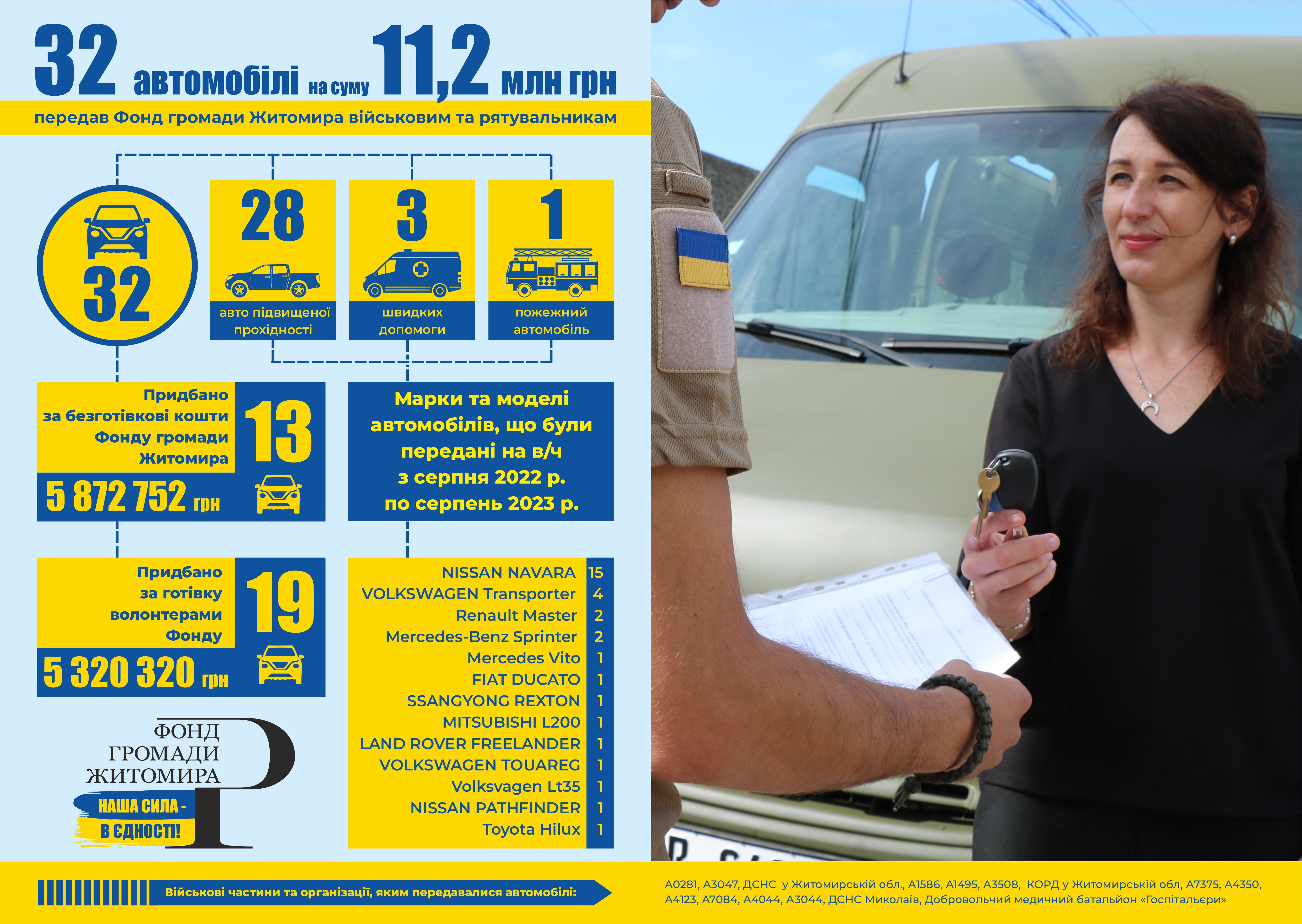 Загалом за 12 місяців (з серпня 2022 по серпень 2023 р.) спільними зусиллями вдалося придбати та передати 32 автомобілі, загальною вартістю 11 млн 193 тис. грн., з яких: